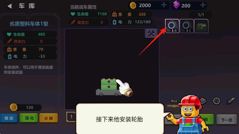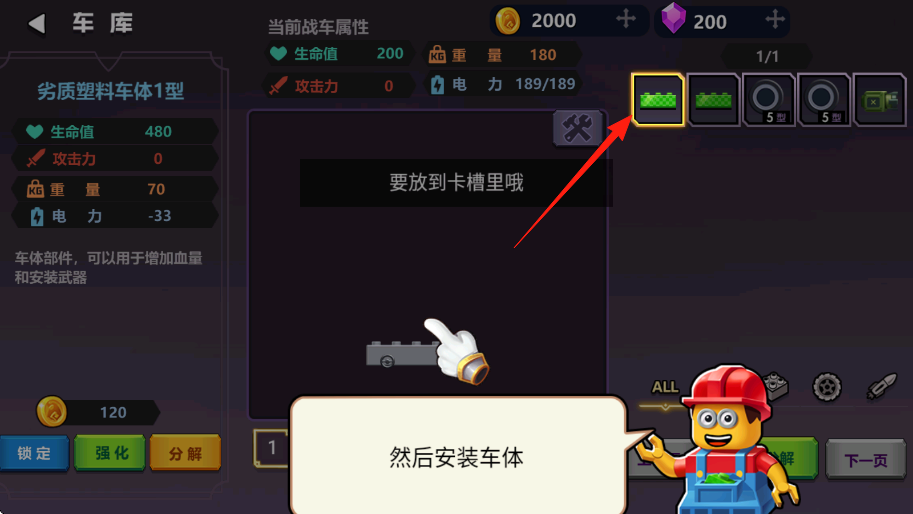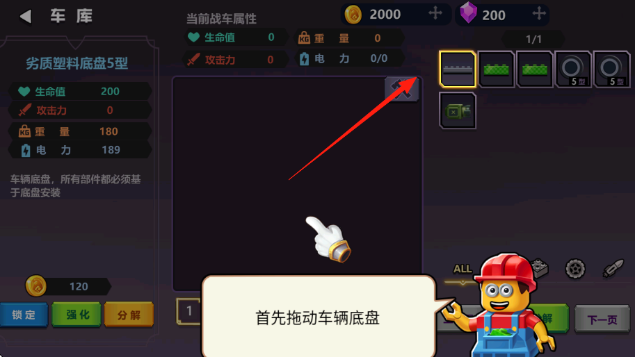 1、進入車庫,先拖動左側(cè)車輛底盤,放置到中間組裝區(qū)域,作為戰(zhàn)車基礎。