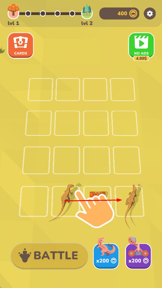 3、戰(zhàn)斗中收集金幣等資源,用于解鎖新卡牌、升級(jí)恐龍屬性,提升整體實(shí)力,同時(shí)推進(jìn)關(guān)卡,解鎖更多場(chǎng)景和玩法。