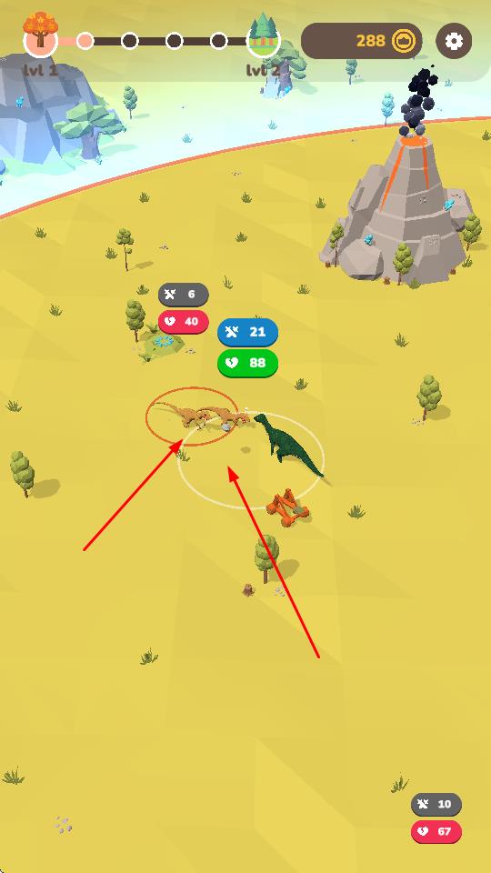 2、進(jìn)入戰(zhàn)斗場(chǎng)景,通過(guò)虛擬搖桿操控己方恐龍移動(dòng),選擇目標(biāo),點(diǎn)擊或滑動(dòng)屏幕指揮攻擊,合理分配恐龍作戰(zhàn)。