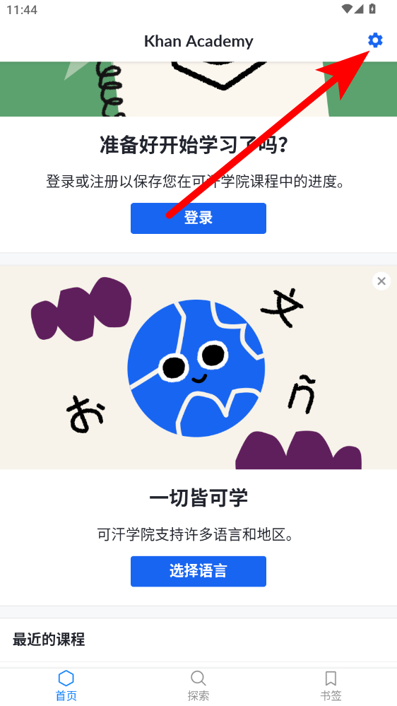 1、在可汗學(xué)院首頁,點擊右上角設(shè)置圖標(biāo),進(jìn)入設(shè)置頁面。