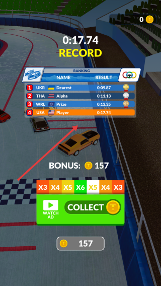 3、沖過終點(diǎn),查看排名(如“Player”排第4)、記錄(0:17.74)與獎勵(157金幣),可“COLLECT”或看廣告翻倍獎勵。