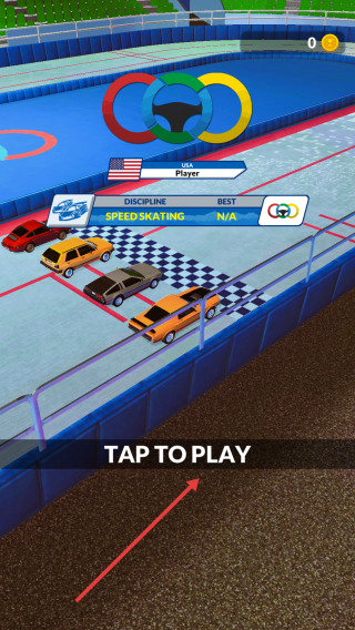 1、點(diǎn)擊“TAPTOPLAY”,選賽車(如橙色車),在奧運(yùn)場館賽道準(zhǔn)備競速。