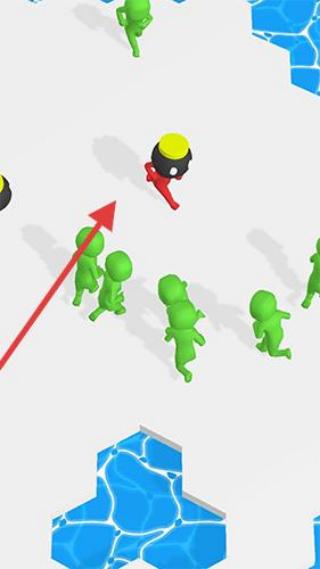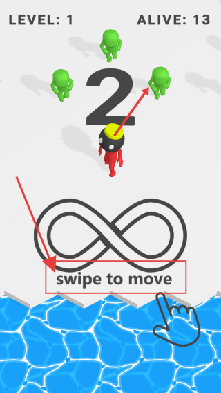 1、初始界面依據(jù)“swipetomove”提示,滑動屏幕操控紅色角色移動,需巧妙避開綠色對手與水域,在環(huán)形賽道區(qū)域周旋。