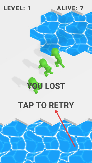 2、若紅色角色不慎落水或被綠色對手淘汰,界面會顯示“YOULOST”,此時點擊“TAPTORETRY”可重新開啟該關(guān)卡挑戰(zhàn)。