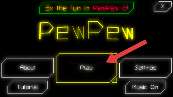 1、這是PewPew的界面截圖,點擊【Play】(開始游戲)方可進入,呈現(xiàn)的是初始選擇界面,引導玩家開始游戲。