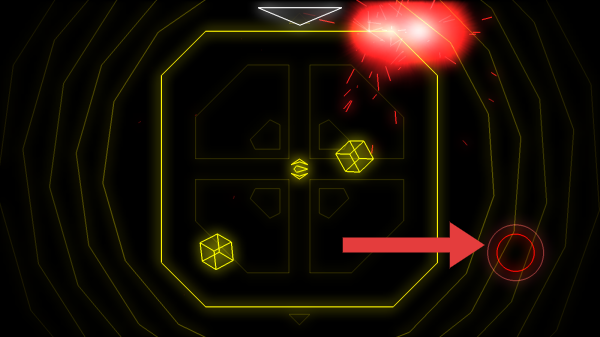 3、屬于射擊躲避類場景,畫面中有黃色幾何圖形構成的場景框架、可操控的中心元素、敵方黃色幾何物體,呈現(xiàn)出射擊與躲避玩法中的戰(zhàn)斗瞬間。