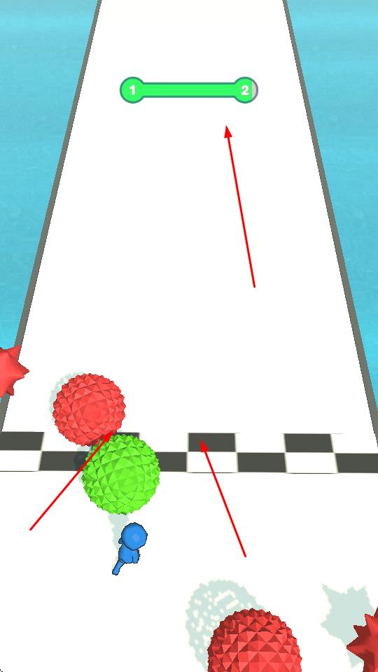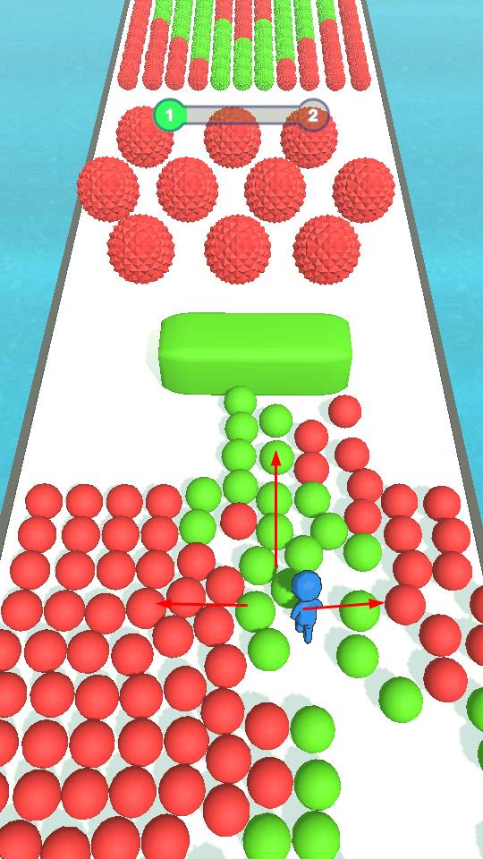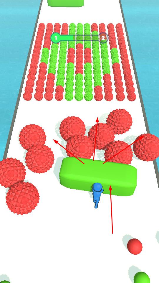 1、操控藍(lán)色小人推動(dòng)綠色長(zhǎng)條塊,利用其推開(kāi)紅色障礙球,開(kāi)辟路徑,同時(shí)收集綠色小球,填充進(jìn)度條。