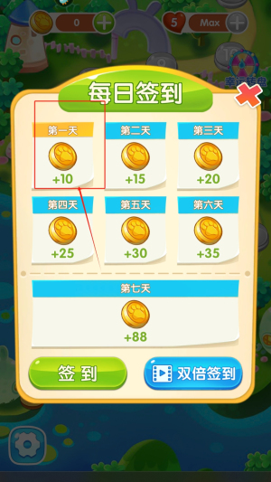 1、在每日簽到界面點(diǎn)擊紅色框選中的"第一天"簽到按鈕,領(lǐng)取10金幣基礎(chǔ)獎(jiǎng)勵(lì),連續(xù)簽到7天可解鎖最高88金幣獎(jiǎng)勵(lì)。