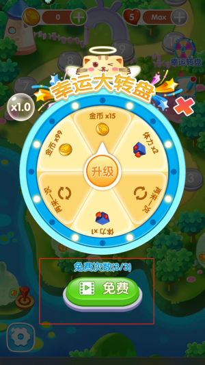 2、進(jìn)入幸運(yùn)轉(zhuǎn)盤界面后,點(diǎn)擊綠色"免費(fèi)"按鈕消耗1次免費(fèi)機(jī)會(huì)啟動(dòng)轉(zhuǎn)盤,隨機(jī)獲得金幣、體力等不同價(jià)值的游戲道具獎(jiǎng)勵(lì)。
