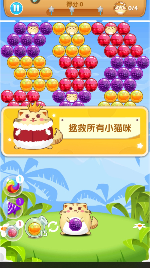 3、操控底部紫色泡泡發(fā)射器,瞄準(zhǔn)上方同色泡泡群發(fā)射,達(dá)成三消連擊解救被困的小貓咪,注意利用左下角特殊道具輔助闖關(guān)。