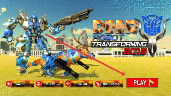 1、點(diǎn)擊【PLAY】進(jìn)入游戲,操控鹿機(jī)器人,在城市場景戰(zhàn)斗,利用變形切換形態(tài),應(yīng)對敵人句號。