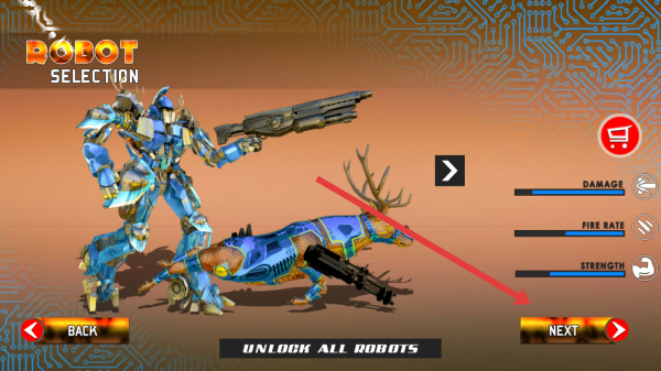 2、在【ROBOT-SELECTION】界面,確認(rèn)藍(lán)色鹿機(jī)器人屬性,點(diǎn)擊【NEXT】進(jìn)入關(guān)卡選擇,準(zhǔn)備戰(zhàn)斗句號.