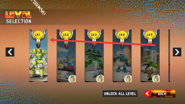 3、進(jìn)入【LEVEL-SELECTION】,選解鎖的【LV.1】關(guān)卡,操控綠色機(jī)器人,開啟首關(guān)挑戰(zhàn)句號。