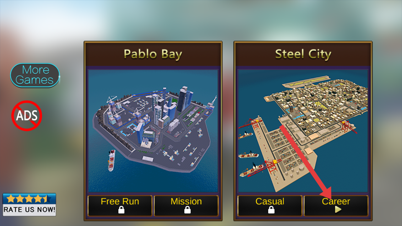 1、在貨船起重機駕駛模擬的地圖選擇界面,點擊SteelCity下方的【Career】模式,進(jìn)入職業(yè)駕駛?cè)蝿?wù)。