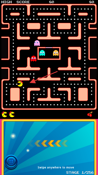 3、滑動(dòng)屏幕控制角色移動(dòng),在迷宮中吃豆并躲避敵人。