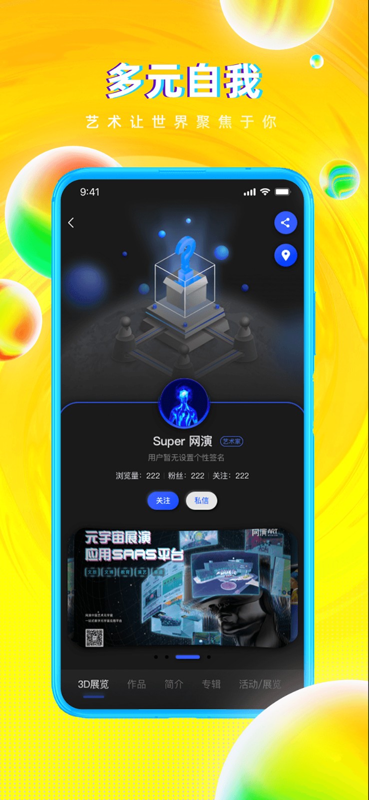 網(wǎng)演APP是一款最新打造的中國數(shù)學(xué)文旅平臺,這里包含了很多的技術(shù),還融入了全新的元宇宙技術(shù),讓你可以輕松創(chuàng)建屬于自己的虛擬美術(shù)館,操作起來很簡單,只需要一鍵就能調(diào)節(jié)好尺寸和位置,隨時(shí)都能分享資訊和交流藝術(shù)!