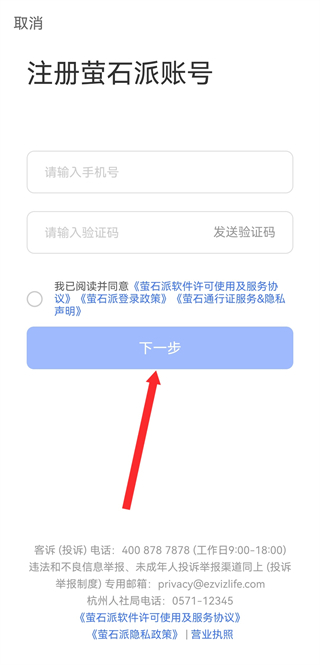 3、進(jìn)入注冊(cè)螢石派賬號(hào)頁面,輸入手機(jī)號(hào)、驗(yàn)證碼后,點(diǎn)擊下一步。