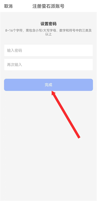 4、進(jìn)入設(shè)置密碼頁面,設(shè)置密碼后點(diǎn)擊完成,完成注冊(cè)操作。