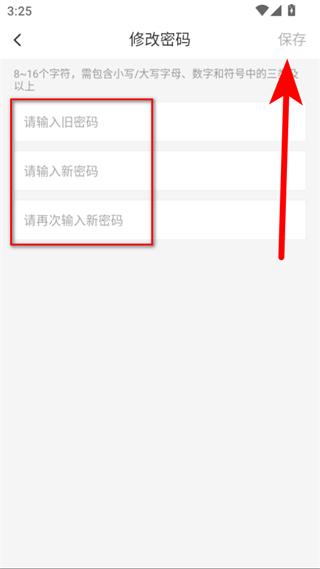 4、在修改密碼頁面,依次輸入舊密碼、新密碼并再次輸入新密碼,點(diǎn)擊右上角的保存按鈕,即可完成密碼修改。