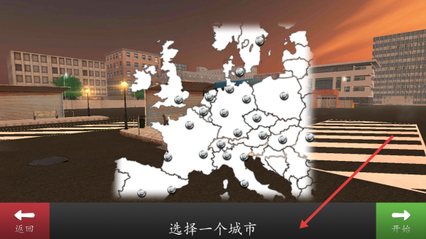 1、主界面點(diǎn)“開始”,進(jìn)入歐洲地圖選城市(如解鎖的標(biāo)記點(diǎn)),確定起點(diǎn)終點(diǎn)。