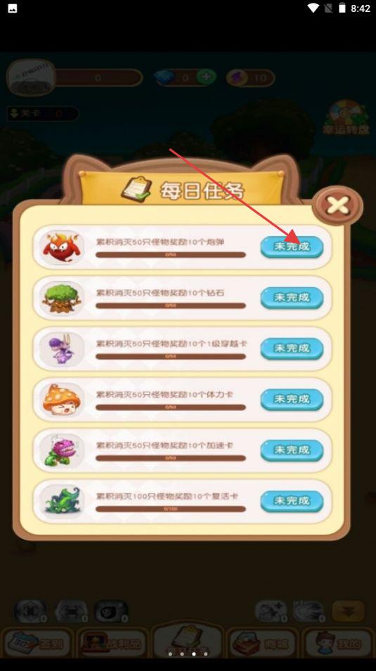 3、完成任務(wù)領(lǐng)取獎(jiǎng)勵(lì)(炮彈、鉆石等),強(qiáng)化彈球,挑戰(zhàn)更高關(guān)卡,推進(jìn)冒險(xiǎn)。