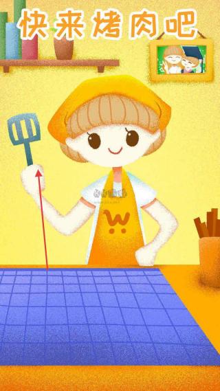 1、進入游戲首先看見的就是游戲宣傳/啟動界面,有卡通角色,文字快來烤肉吧。