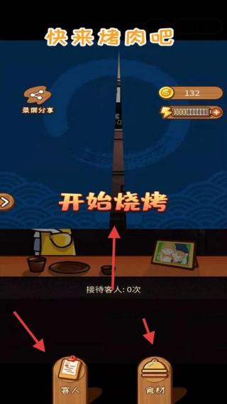 2、游戲主界面,顯示快來烤肉吧有開始燒烤按鈕,可查看客人和食材,還有錄屏分享金幣132,電力1000000000等信息。