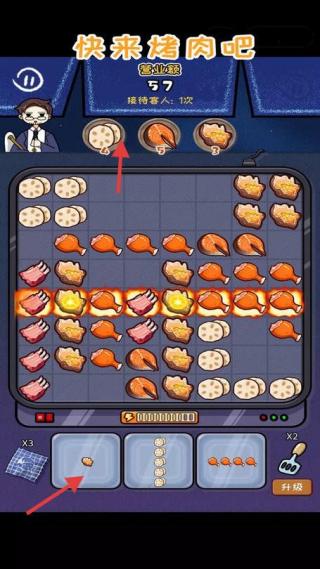 3、游戲烤肉操作界面,關卡第10級,接待客人1次,有食材格子、操作按鈕,紅色箭頭指向食材和操作區(qū)。