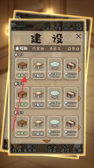 1、進(jìn)入“建設(shè)”界面,用金幣解鎖、升級(jí)桌椅(如桌子1),布置餐廳場(chǎng)景。