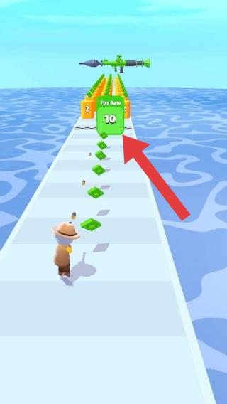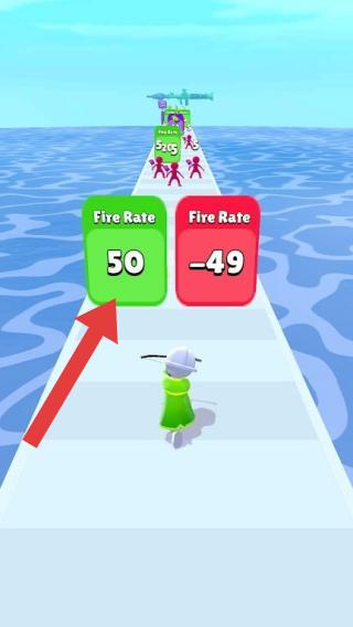 3、呈現(xiàn)角色在跑道上面對FireRate屬性方塊(綠色+50、紅色-49)的玩法場景,符合高個子跑酷通過選擇屬性方塊強(qiáng)化自身的玩法邏輯。