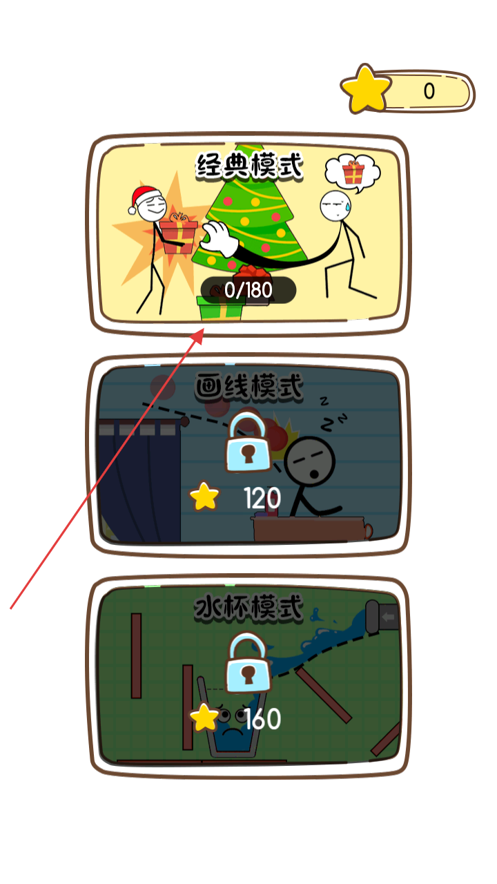 1、在主界面選模式(經(jīng)典/畫(huà)線/水杯),如經(jīng)典模式,按提示完成180小關(guān)目標(biāo)。