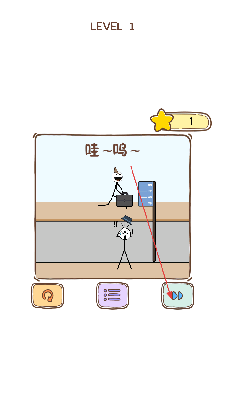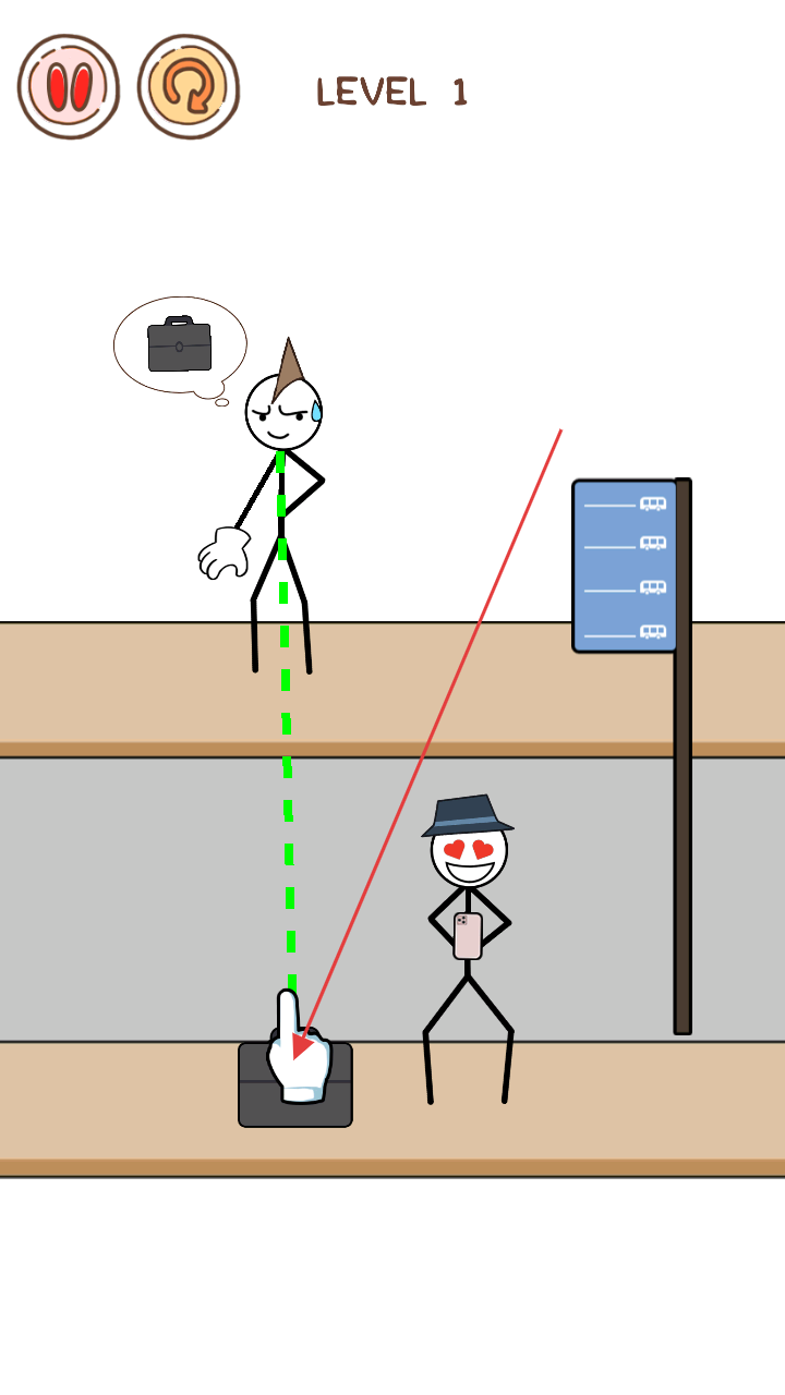 2、進(jìn)入關(guān)卡(如LEVEL1),觀察火柴人需求(拿公文包),點(diǎn)擊/畫(huà)線引導(dǎo)行動(dòng)。