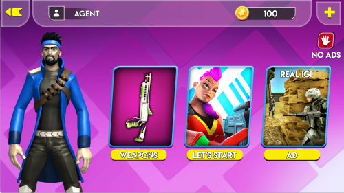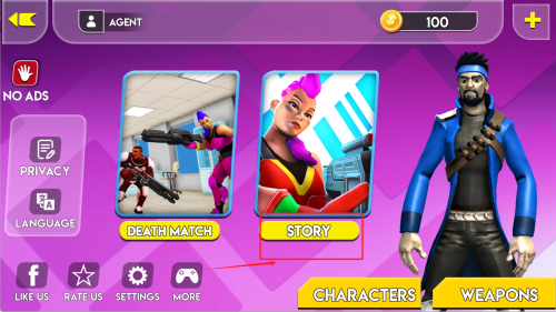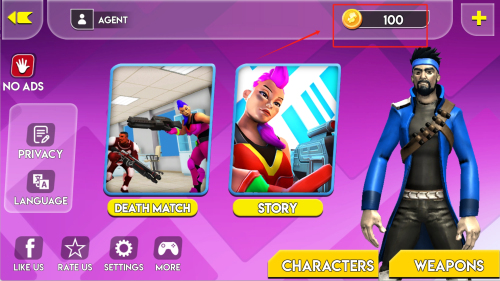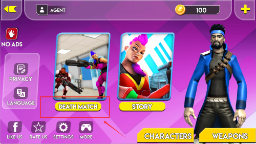 1、進(jìn)入游戲主界面查看右上角金幣數(shù)量100,點(diǎn)擊左側(cè)NO ADS按鈕可移除廣告干擾,選擇DEATH MATCH模式開始對(duì)戰(zhàn)。