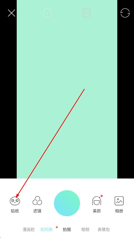 2、進(jìn)入拍攝界面,點(diǎn)擊底部貼紙按鈕,打開貼紙選擇欄,瀏覽熱門、最新等分類,挑選喜歡的貼紙樣式。