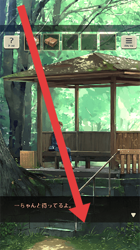 3、來到林間亭子場景,跟隨紅色箭頭,點擊亭子下方箭頭指向的臺階區(qū)域,探索新場景,解鎖后續(xù)游戲內(nèi)容。