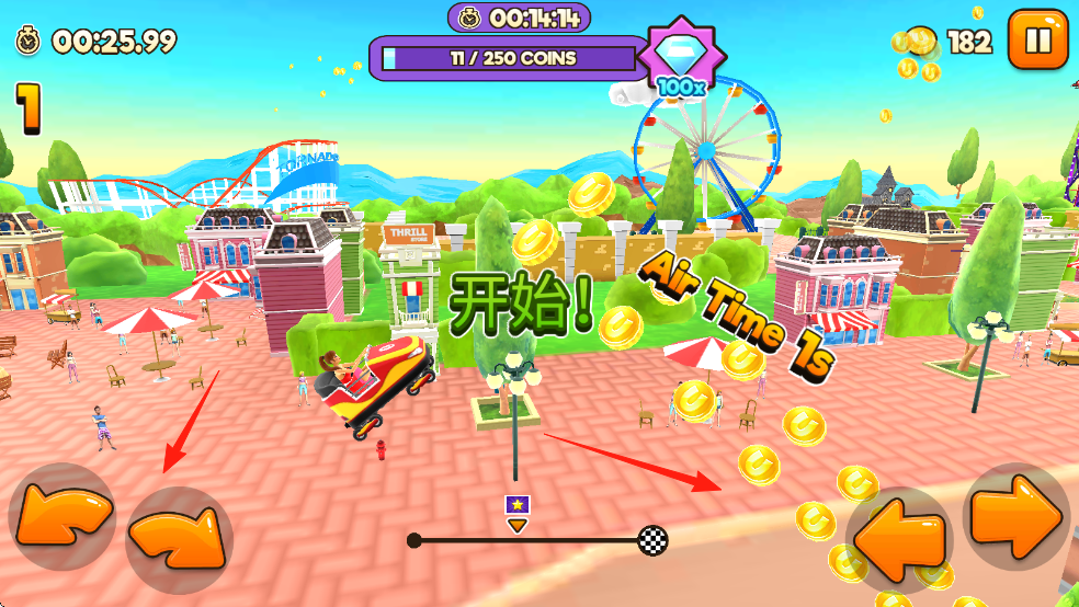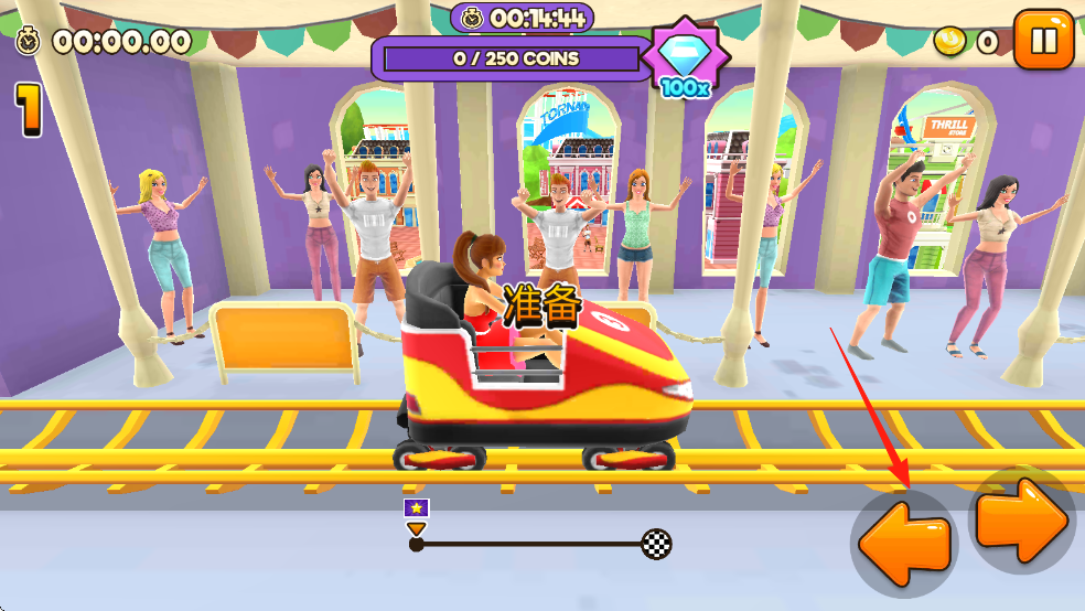 2、過(guò)山車準(zhǔn)備界面,顯示準(zhǔn)備,有操作按鈕(左右箭頭),上方有250COINS(金幣)00:17:44(時(shí)間)”等信息。
