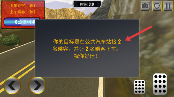 2、查看任務(wù)提示,需在公共汽車(chē)站接【2名】乘客,同時(shí)讓【2名】乘客下車(chē),明確載客目標(biāo)。