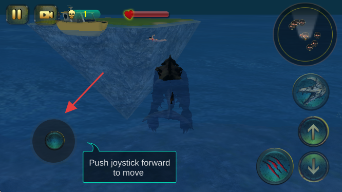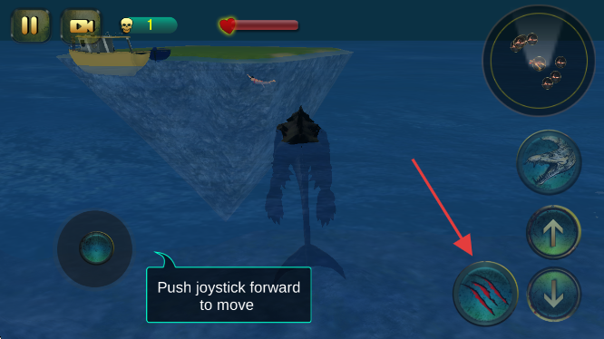 2、操控左側(cè)虛擬搖桿,向前推動(dòng)控制海洋怪獸移動(dòng),接近目標(biāo)。