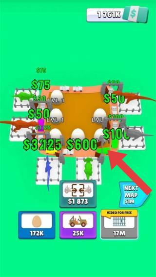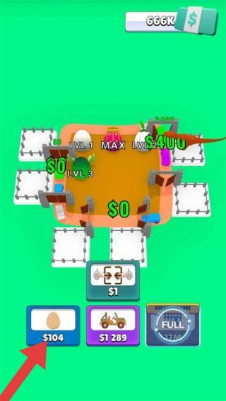 3、恐龍園區(qū)場(chǎng)景,顯示恐龍等級(jí)、收益、還有蛋、車輛等購(gòu)買/升級(jí)按鈕,呈現(xiàn)恐龍公園經(jīng)營(yíng)中培育、升級(jí)恐龍及設(shè)施,獲取收益的玩法。