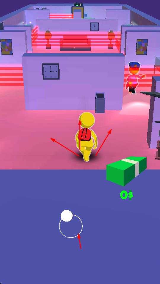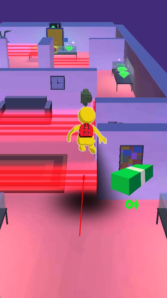 1、操控黃色小人,通過虛擬搖桿在室內場景移動,避開巡邏警察,繞過紅色激光區(qū)域,隱藏行蹤。