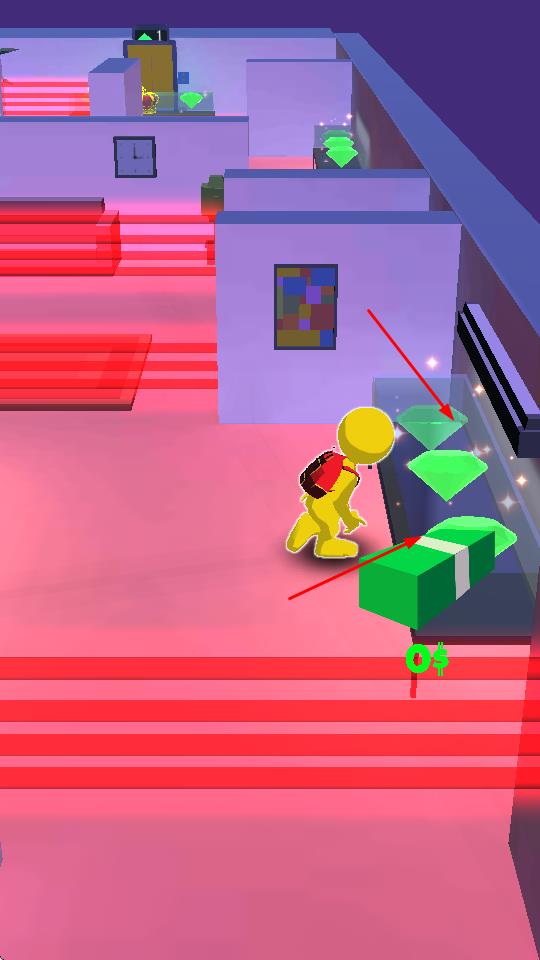 2、靠近綠色鉆石、現金堆等財物,自動拾取,裝入背包,需規(guī)劃路線,高效收集場景內貴重物品。