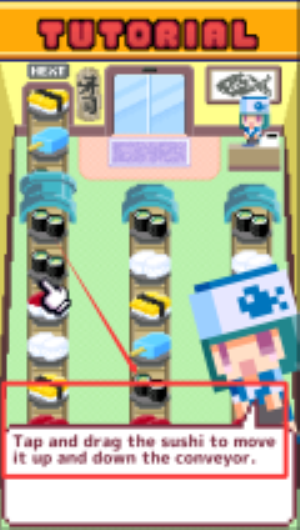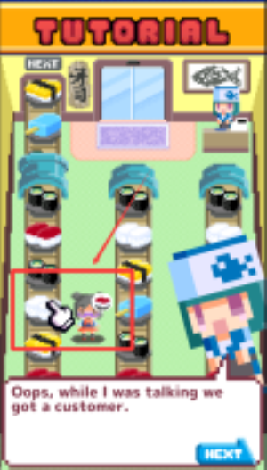 1、玩家化身壽司店主佩科,通過快速翻動(dòng)盤子為排隊(duì)的饑餓顧客提供食物,完成訂單獲取游戲分?jǐn)?shù)與金幣。