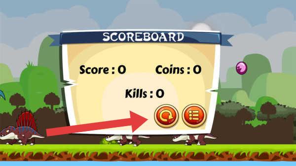 3、結(jié)算頁,查看“Score”“Coins”“Kills”數(shù)據(jù),點擊箭頭指向的【重玩】按鈕,重新挑戰(zhàn)關(guān)卡,提升成績。