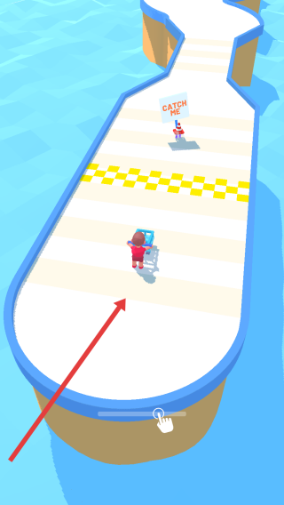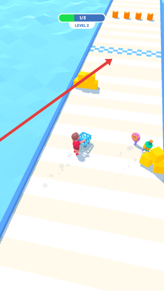 1、進(jìn)入游戲,操控角色推購物車,沿箭頭指引路徑,在水上跑道前進(jìn),注意躲避障礙,完成“Catch”目標(biāo)。