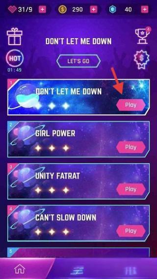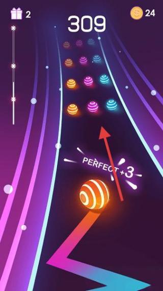 1、進入游戲后選擇一首喜歡的曲目,小球會隨音樂自動向前移動,通過左右滑動屏幕控制小球切換軌道。