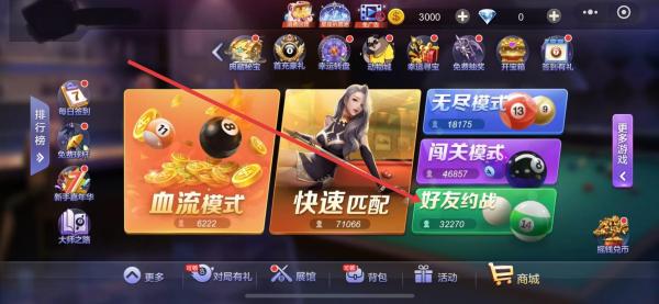 1、打開臺(tái)球游戲進(jìn)入主界面,找到帶有好友約戰(zhàn)字樣的選項(xiàng)通常會(huì)展示約戰(zhàn)相關(guān)圖標(biāo),點(diǎn)擊開啟與好友在線對(duì)戰(zhàn)的約戰(zhàn)流程,進(jìn)入專屬約戰(zhàn)頁面。