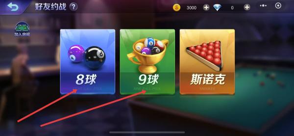 2、進(jìn)入好友約戰(zhàn)專屬頁面后,能看到8球,9球,斯諾克三種不同臺(tái)球玩法,每種玩法對(duì)應(yīng)經(jīng)典的臺(tái)球規(guī)則,選擇其中一種玩法,確定本次對(duì)戰(zhàn)規(guī)則模式。