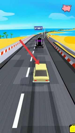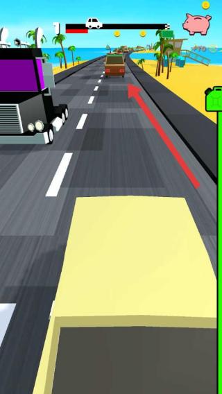 1、在海濱公路場(chǎng)景,駕駛黃色汽車,躲避紫色卡車等障礙,收集金幣,關(guān)注右上角油量。