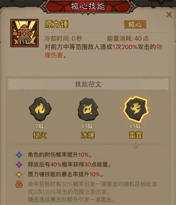 2、核心技能:冷卻0秒,消耗40點(diǎn)能量,對(duì)前方中等范圍敵人造成200%攻擊物理傷,技能符文有7級(jí)獄火、15級(jí)冰爆、15級(jí)雷霆,雷霆觸發(fā)雷擊額外傷。