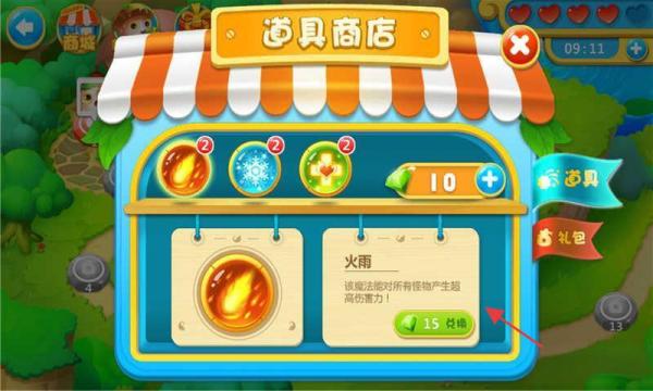 2、在道具商店,消耗15鉆石,兌換“火雨”道具,用于群體清怪。